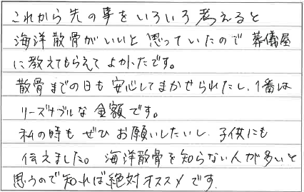 これから先の事をいろいろ考えると海洋散骨がいいと思っていたので葬儀屋に教えてもらえてよかったです。