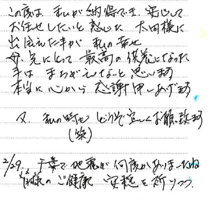 この度は、私が納得でき、安心してお任せしたいと感じた太田様に出会えた事が 私の幸せ 母、兄にとって最高の供養になった事は まちがえないと思います。本当に心から感謝申しあげます。又、私の時(笑)もどうぞ宜しくお願い致します。2/29に千葉で地震が何度かありましたね。皆様のご健康 安穏を祈りしつつ