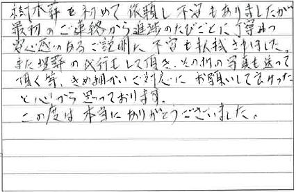 樹木葬を初めて依頼し不安もありましたが最初のご連絡から進捗のたびごとに丁寧且つ安心感のあるご説明に不安も払拭されました。また埋葬の代行もして頂き、その折りの写真も送って頂く等、きめ細かいご対応にお願いして良かったと心から思っております。この度は本当にありがとうございました。