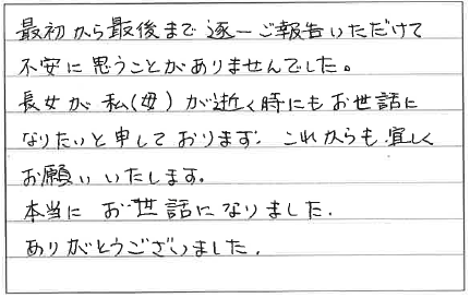最初から最後まで 逐一ご報告いただけて不安に思うことがありませんでした。