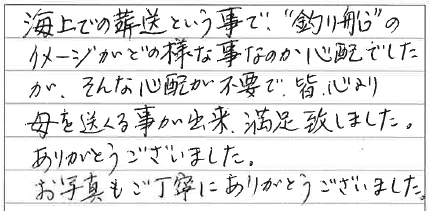 海上での葬送という事で、”釣り船”のイメージがどの様な事なのか心配でしたが、そんな心配が不要で、皆、心より母を送る事が出来、満足致しました。